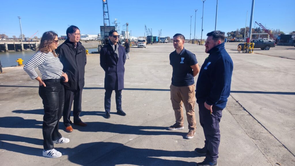Una delegación de empresarios chinos de la empresa Altamare visitó el Puerto de Rawson, interesada en explorar posibles inversiones en el sector pesquero local. La comitiva fue recibida por la Dra. Gisela Silva, Directora General de Puertos de Explotación Directa, quien acompañó el recorrido.